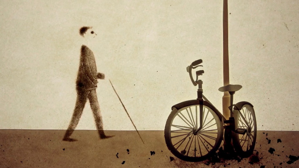 The Parisian landscape is created from layers of cut back-lit paper, and the city’s inhabitants are animated with sand on a layer of glass above the scenery. The blind protagonist navigates his world through a myriad of familiar sounds including footsteps, trains, and the flapping of birds’ wings. The animation is timed carefully with the city-noises, and the clean, crisp sounds guide the man as well as the viewer.